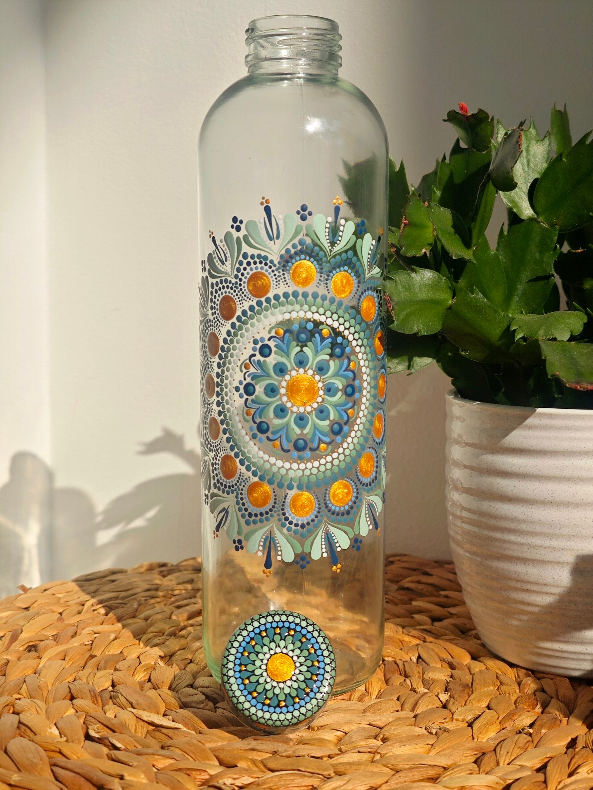 Genieße nicht nur erfrischendes Wasser, sondern auch die beruhigende Pracht der Mandalakunst.